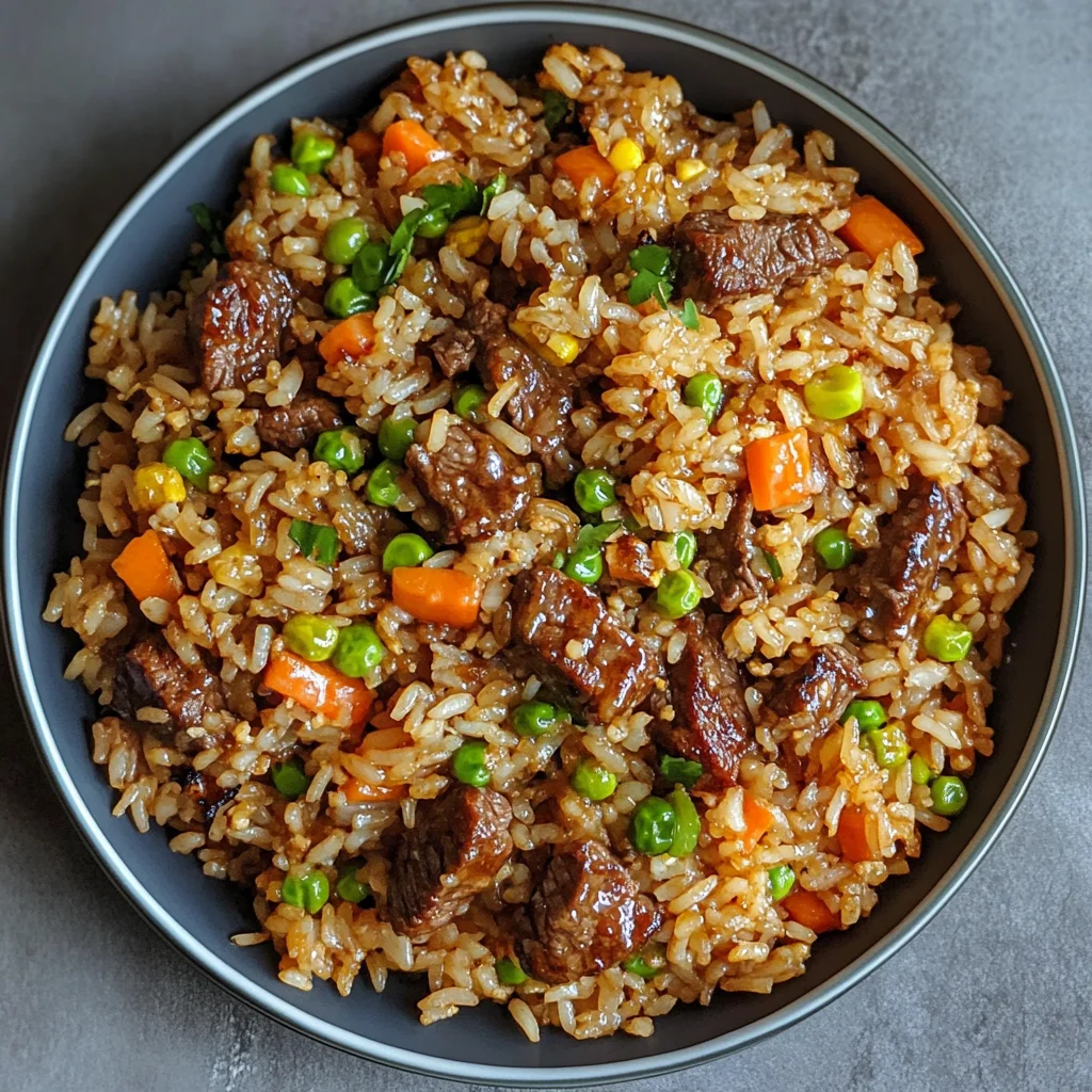 A delicious and hearty fried rice dish featuring tender beef and savory onions, perfect for a quick meal.